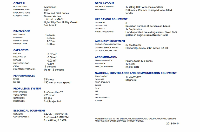 發電機組: 2×Caterpilar C7 船組人員: 2 P