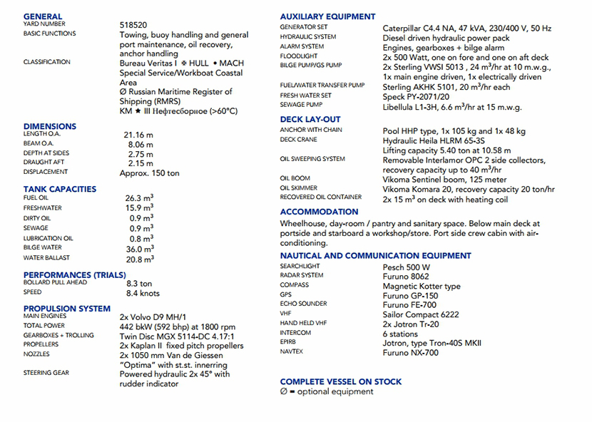 發(fā)動(dòng)機(jī)功率: 442bkW at 1800rpm 推進(jìn)裝置: 2×Kaplan II fixed pitch, propellers