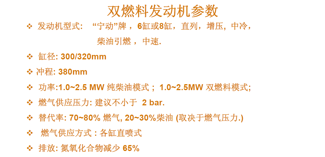 沖程: 380mm 發動機形式: “寧動”牌,6缸或8缸,直列,增壓,中冷,柴油引燃,中速