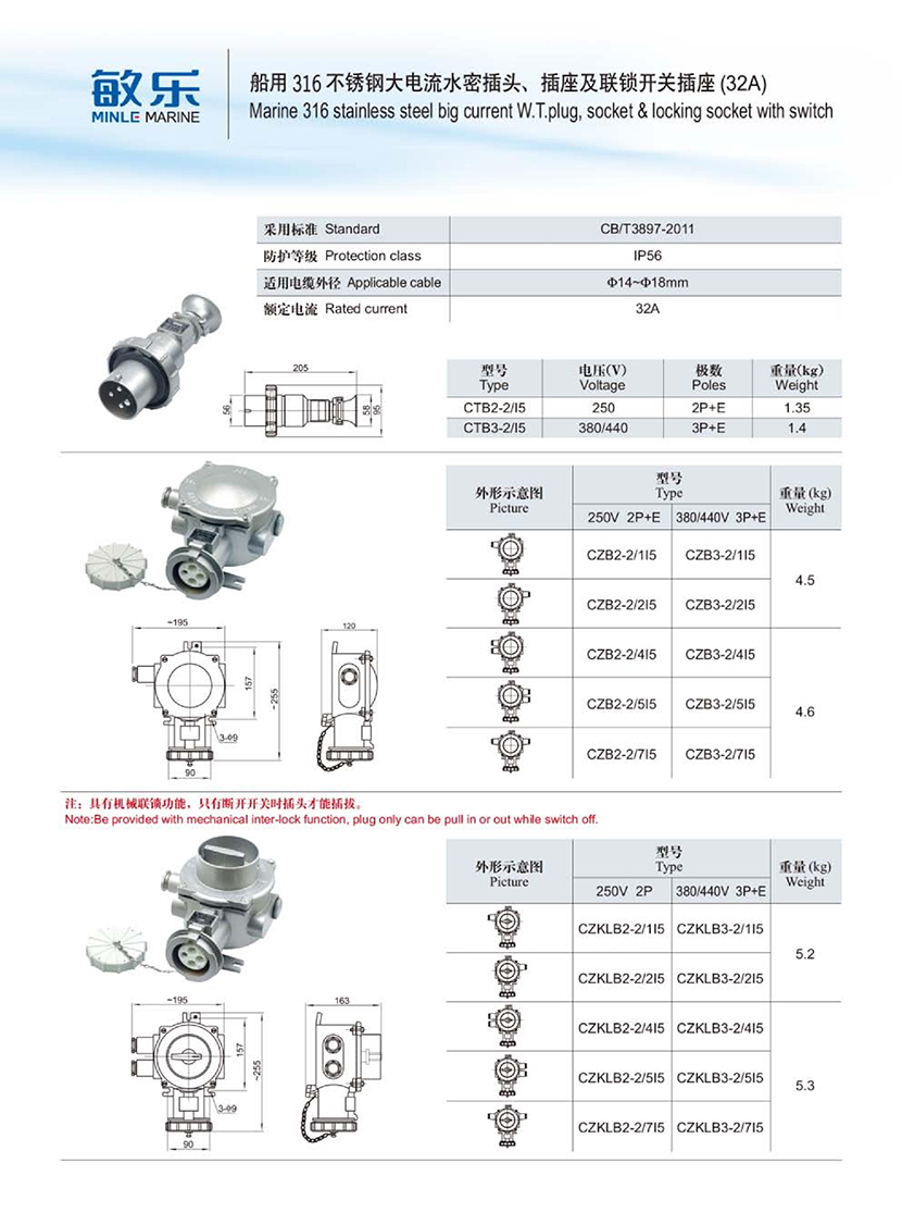 船用316不銹鋼大電流水密聯鎖開關插座(32A)