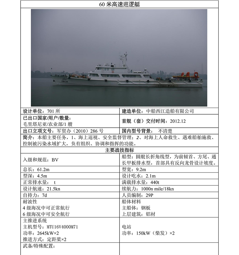 平臺 60米高速巡邏船
