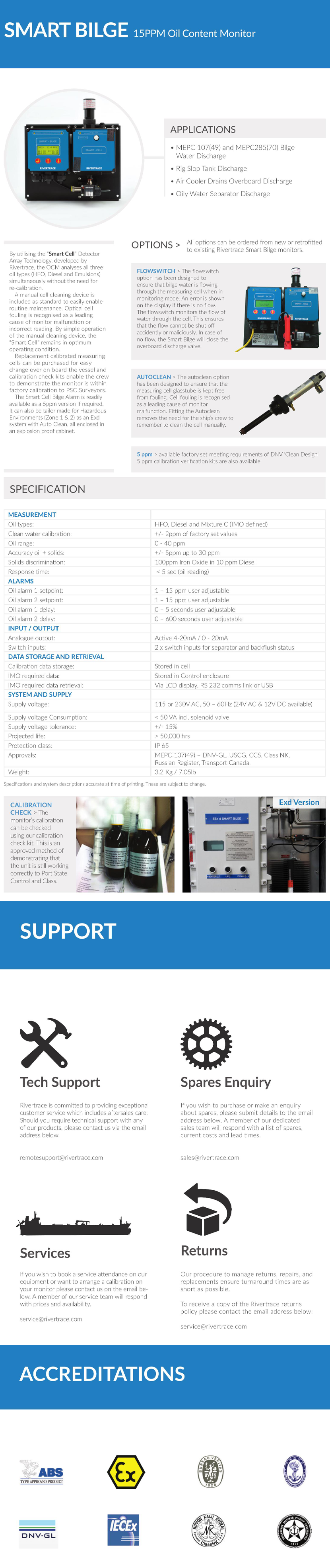 符合標準: MEPC 107(49) – DNV-GL, USCG, CCS, Class NK, Russian Register, Transport Canada 性能亮點: The OCM can analyse all three oil types simultaneously without the need for re-calibration ; Replacement calibrated measuring cells can be changed