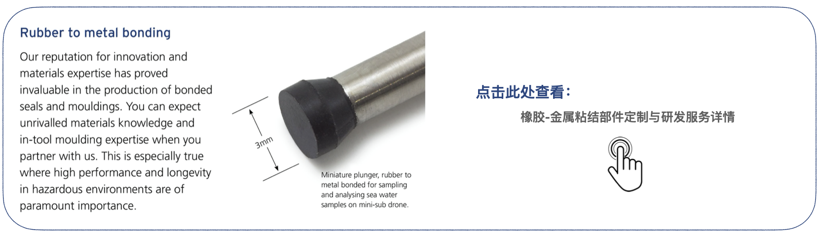 應用領域: 水下工程;油氣開發;聲吶類產品;實時影像捕捉系統;水下機器人;泵類產品;閥類產品;壓縮機類產品;齒輪箱;變壓器;傳動設備;纜線密封;電池;新能源類裝備;各種控制、電氣保護、通信及監測類配套系統等 技術優勢: 豐富的材質數據庫,應對各類復雜及高難度應用需求;即使是硬度極地的橡膠,也能提供精確塑膜;應對更高的密封需求;更低的磨損;更長的使用壽命;完善的模具設計及除塵技術可保證成品的完成度及理想的耐損力;充分考慮使用環境提供精準契合的定制方案;優秀的物理性能降低運維成本
